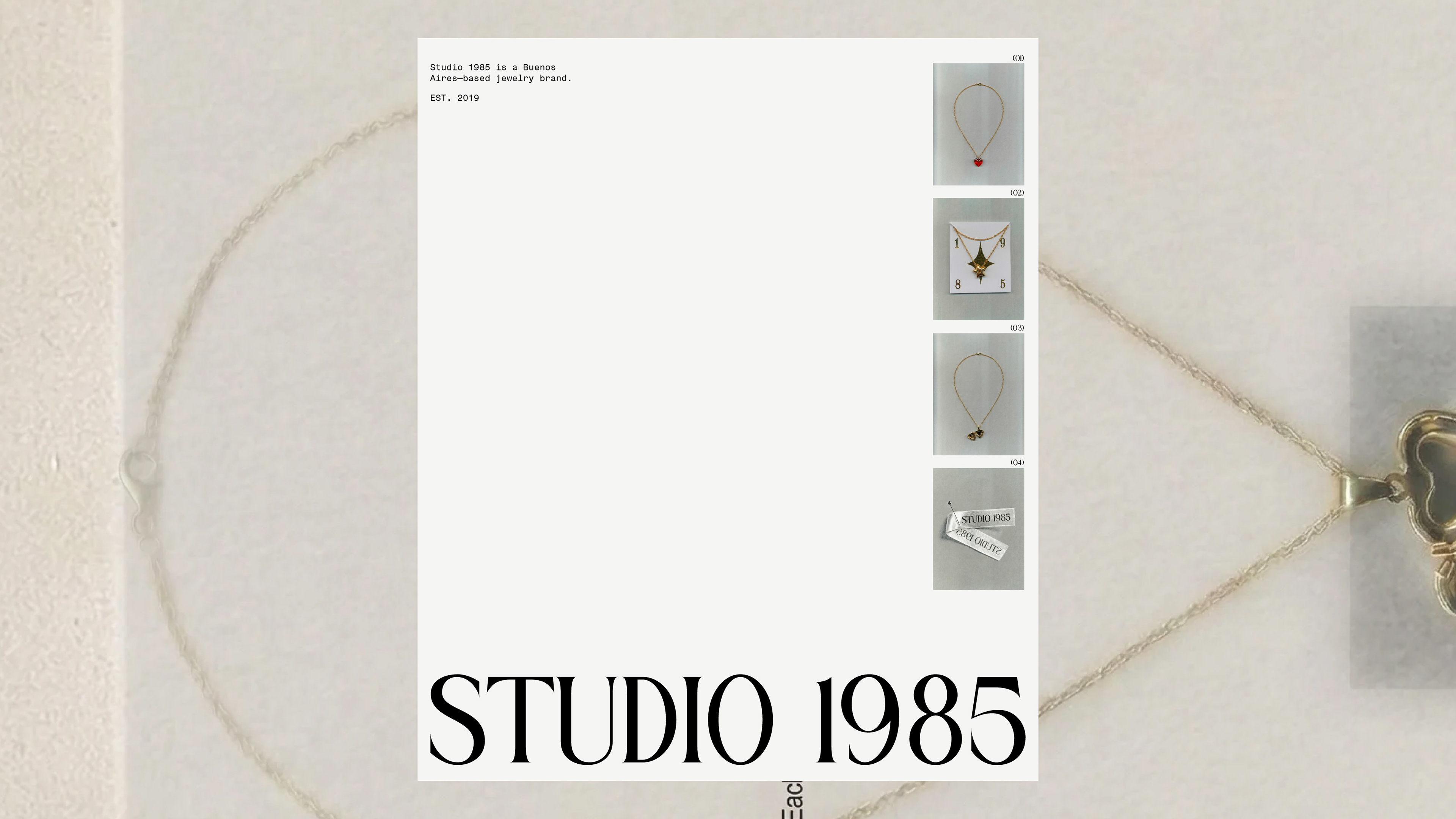 For Studio 1985, a Buenos Aires–based jewelry brand, I developed the complete brand identity, translating its handcrafted and contemporary aesthetic into a cohesive visual system. The project defined a refined yet expressive language designed to enhance the brand’s presence across digital platforms, packaging, and communication.
